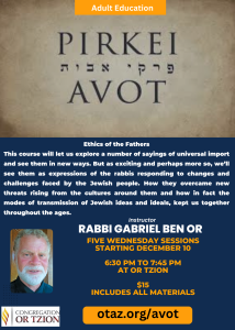 This course will let us explore a number of sayings of universal import and see them in new ways. But as exciting and perhaps more so, we’ll see them as expressions of the rabbis responding to changes and challenges faced by the Jewish people. How they overcame new threats rising from the cultures around them and how in fact the modes of transmission of Jewish ideas and ideals, kept us together throughout the ages.